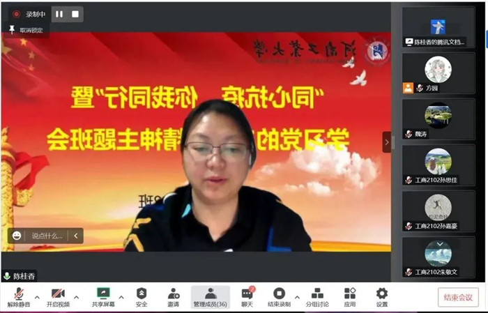 11月29日晚,河南工业大学副校长陈桂香与工商管理2102班全体同学通过腾讯会议线上召开“同心抗疫,你我同行” 暨学习党的二十大精神主题班会,为同学们了解党的二十大精神、珍惜来之不易的抗疫成果、携手努力打赢校园疫情防控保卫战加油鼓劲。