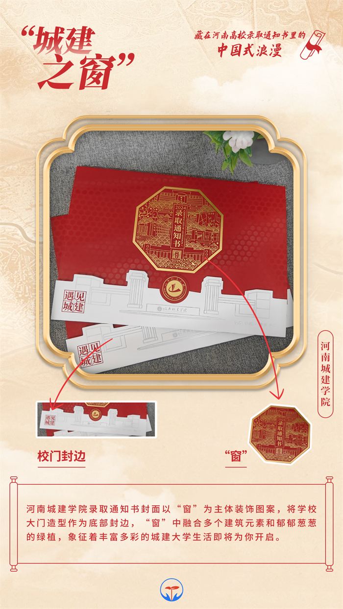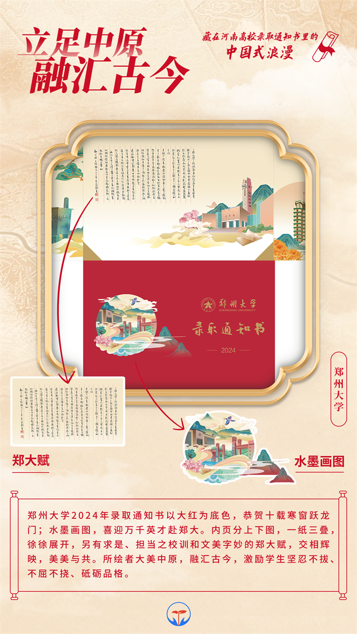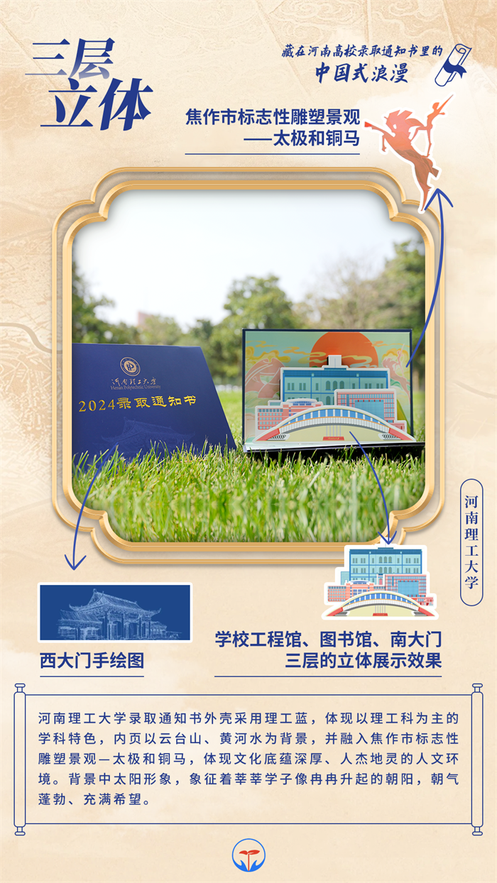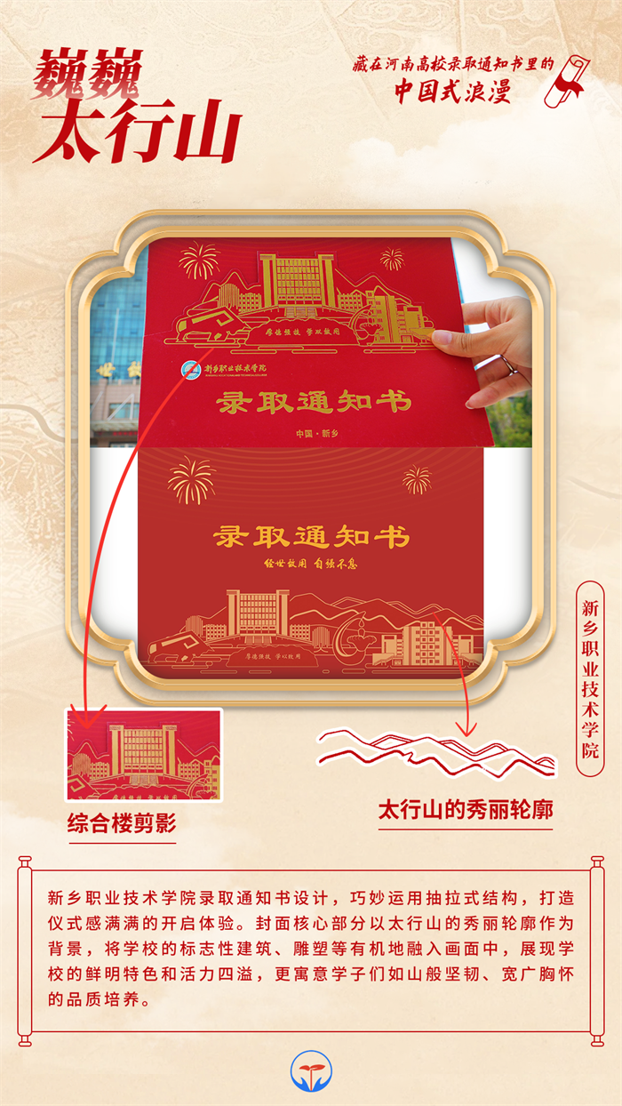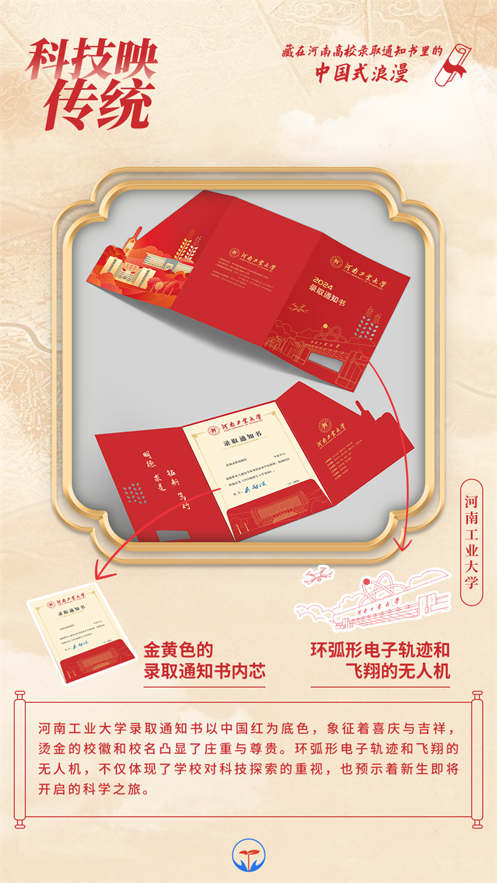 近日,我省各高校录取通知书陆续亮相。有的一纸三叠,徐徐展开,极具中原风韵;有的传统而又现代,典雅大气,寓意深远;有的以太极、铜马为背景,文化底蕴深厚;还有的以科技映传统,融合科技元素与传统文化,展现学校教育理念……一起看藏在河南高校录取通知书里的中国式浪漫。